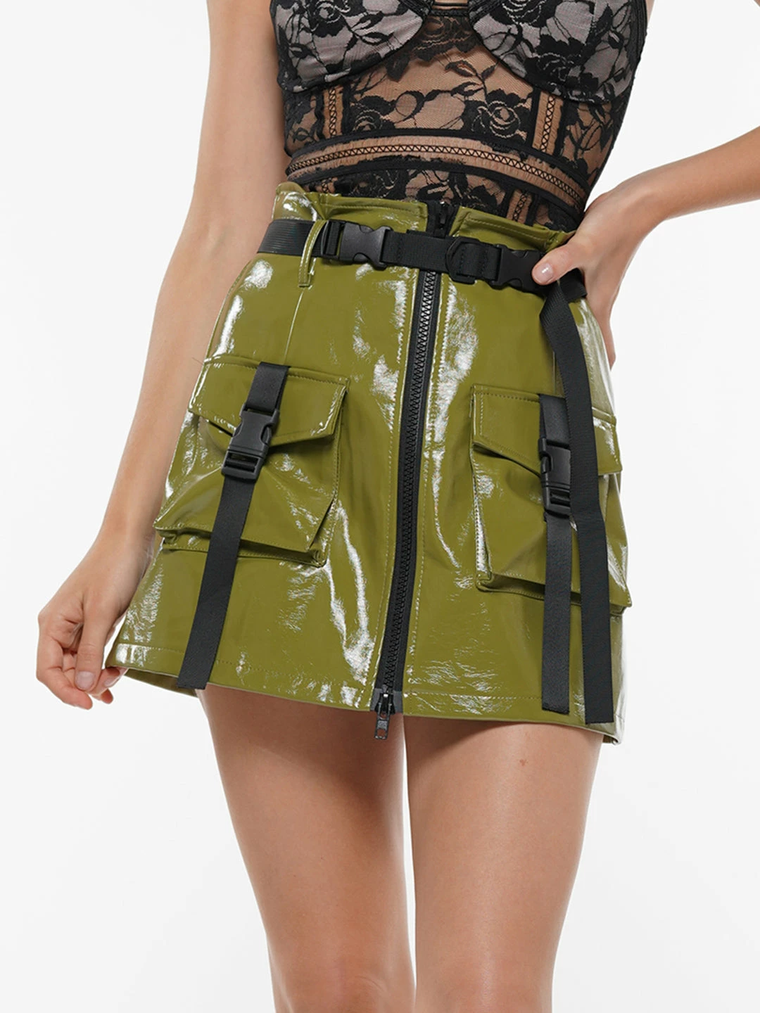 Why Dress POCKET ZIP FRONT BELTED LEATHER MINI SKIRT